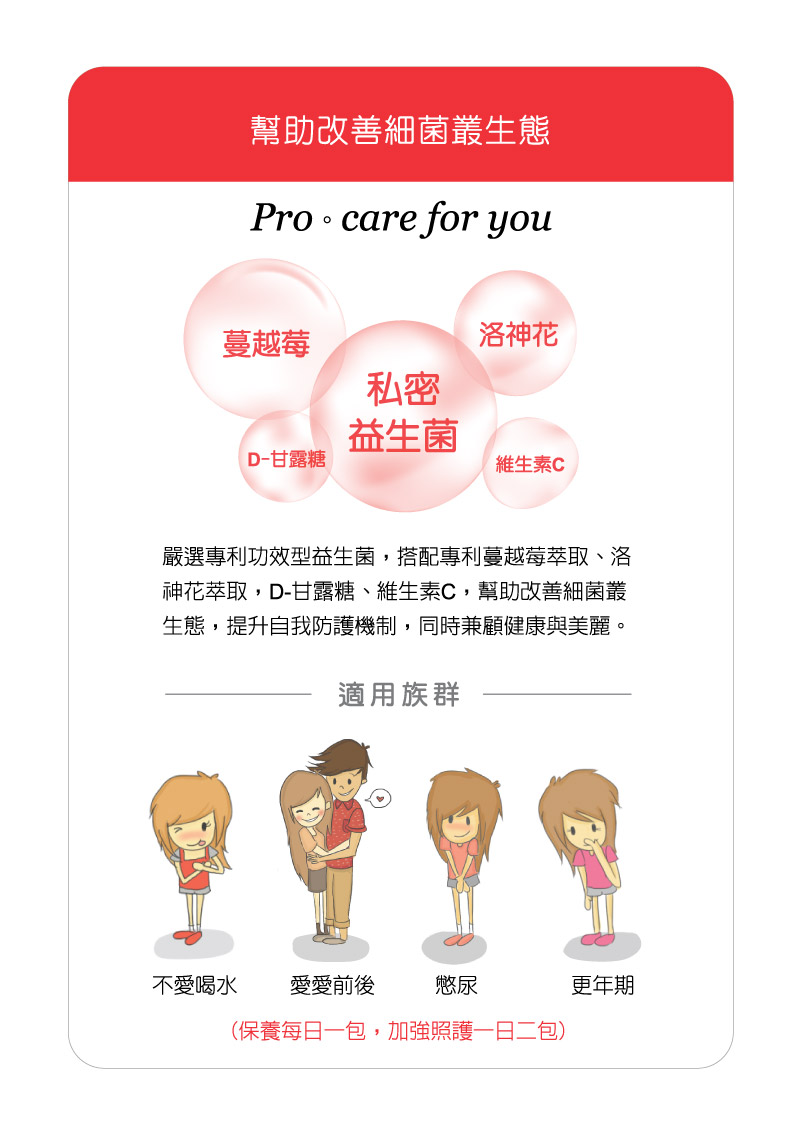 具有強大改變細菌叢生態的專利私密益生菌,搭配專利包埋緩釋技術的蔓越莓萃取,搭配洛神花萃取、甘露糖等優良配方,迅速感受舒適,私密問題不再困擾。酸甜口感、攜帶方便,是女性秘密保養的必備品。內 容 量:30包/盒 (每包2g)