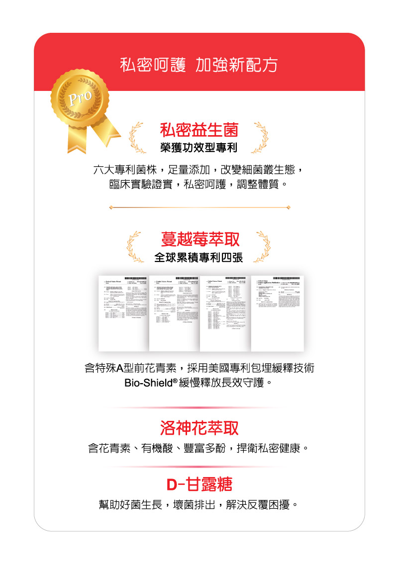 主成分:洛神花萼萃取、專利蔓越莓萃取、甘露糖、維生素C、專利乳酸菌(Lactobacillus helveticus LA25、